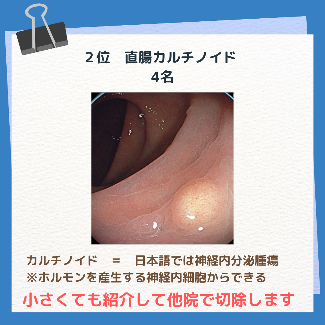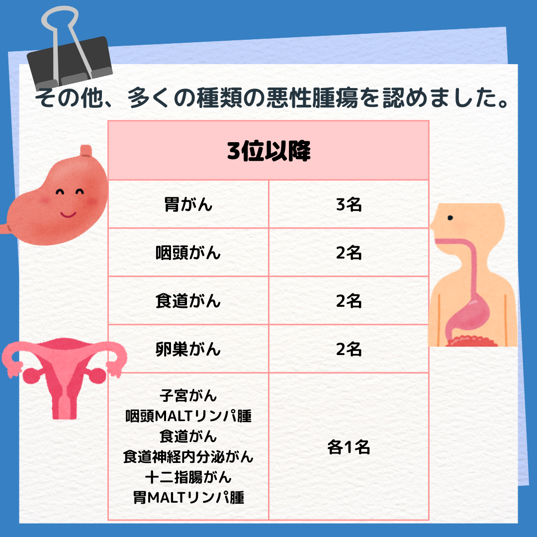 その他、直腸カルチノイド、十二指腸癌、咽頭癌、食道癌もおられました。